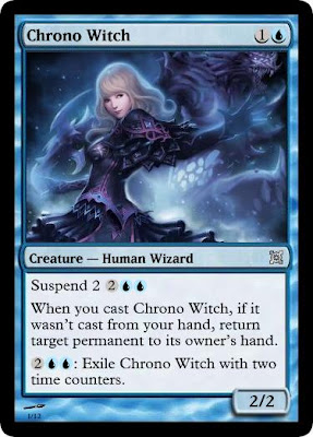 What I wanted to try was combining the design space of the repeating spell, with the flicker/return to hand bounce that some blue creatures are known for. I give you Chrono Witch. What might be interesting to try for the future is alternative suspend costs in place of just mana.